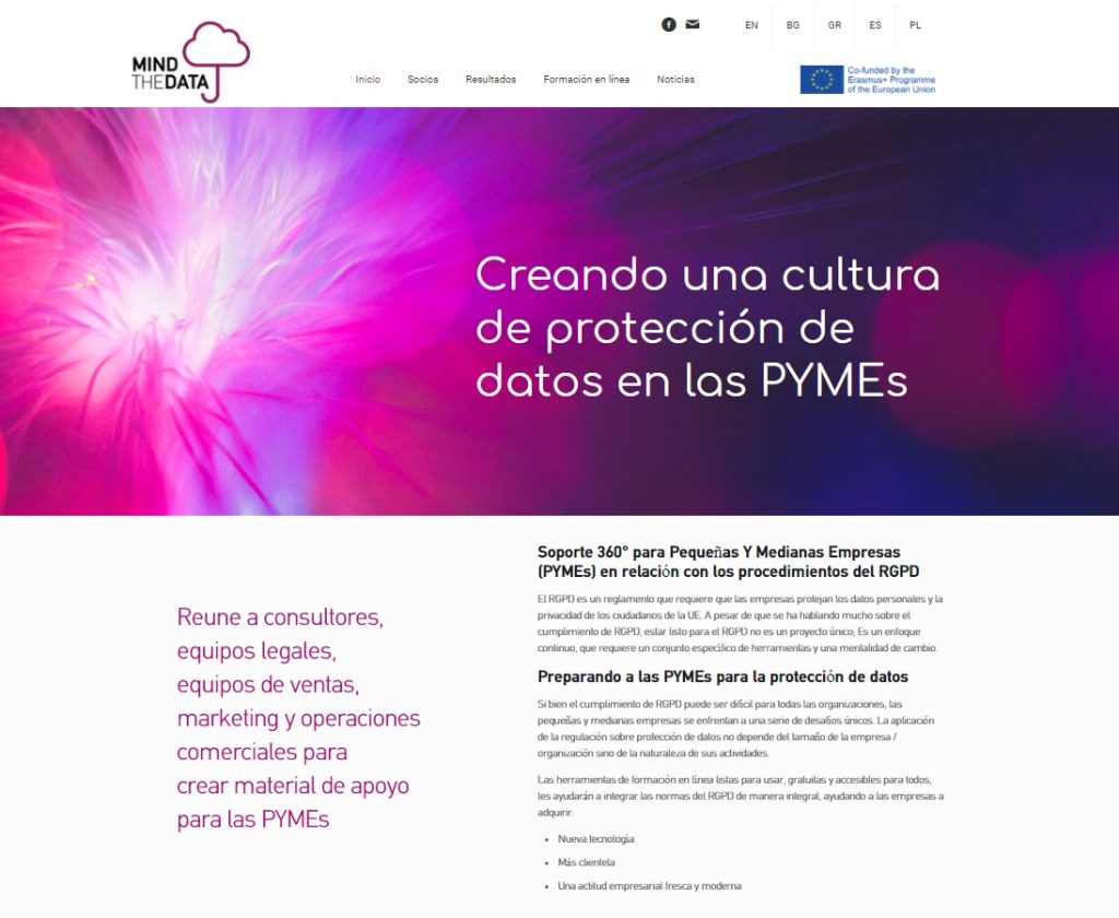 Con socios participantes de Bulgaria, Grecia, Polonia y España, el objetivo de MindTheDATA es facilitar a las empresas su incorporación a la nueva Ley de Protección de datos (en España aprobada el pasado 5 de diciembre de 2018 , la «Ley Orgánica de Protección de Datos y garantía de los derechos digitales».