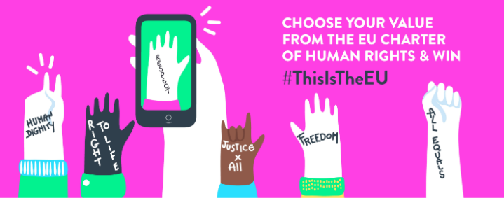 Comparte en redes sociales lo que la UE significa para ti o elige tu Artículo favorito de la Carta de los Derechos Fundamentales de la Unión Europea, escríbelo en tu mano o en tu cara, hazte una foto y explica el por qué de tu elección.