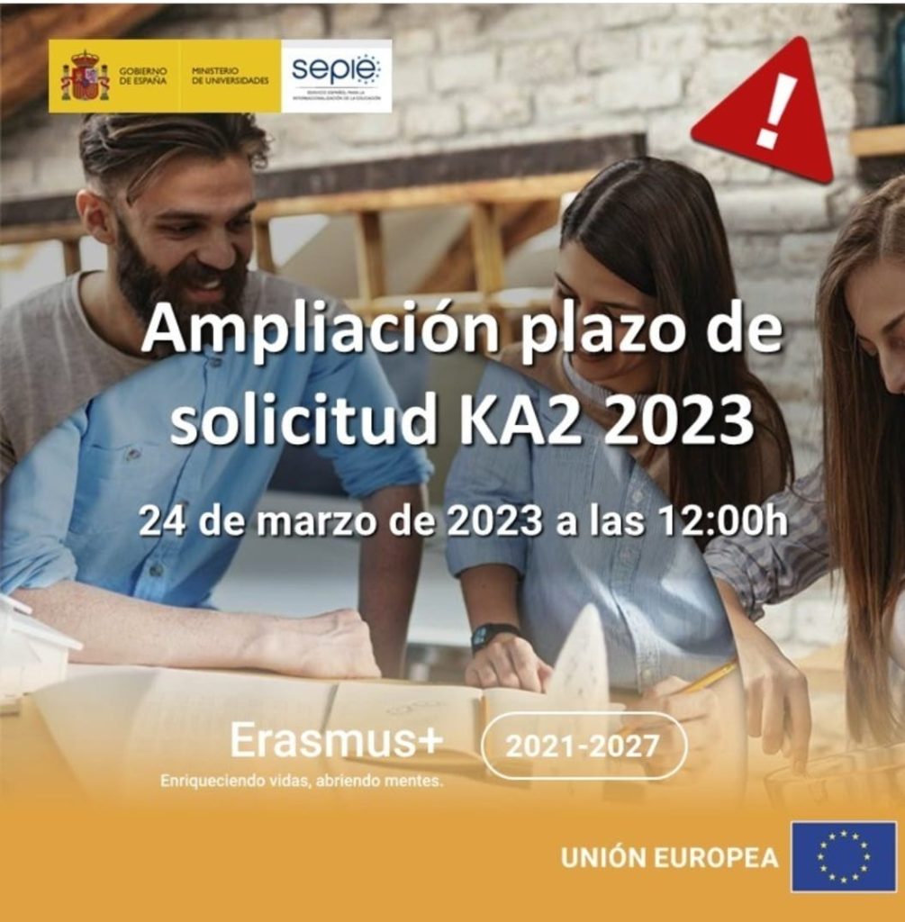 La Comisión Europea ha anunciado que, debido a los continuos problemas de rendimiento técnico que afectan a los formularios de solicitud, se amplía la fecha límite de presentación de solicitudes de proyectos KA2 de la convocatoria 2023 al 24 de marzo de 2023 a las 12:00h (hora de Bruselas).