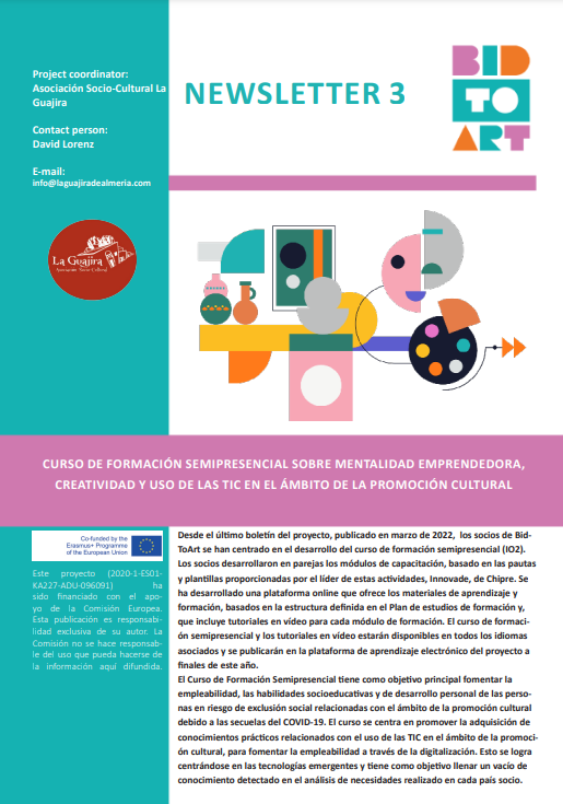 Desde el último boletín del proyecto, publicado en marzo de 2022, los socios de BidToArt se han centrado en el desarrollo del curso de formación semipresencial (IO2). Los socios desarrollaron en parejas los módulos de capacitación, basado en las pautas y plantillas proporcionadas por el líder de estas actividades, Innovade, de Chipre. Se ha desarrollado una plataforma online que ofrece los materiales de aprendizaje y formación, basados en la estructura definida en el Plan de estudios de formación y, que incluye tutoriales en vídeo para cada módulo de formación.