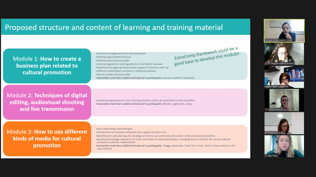 Todos los socios nos hemos centrado, sobre todo, en el cierre del primero de los 3 resultados, eBook: Curriulum en mentalidad emprendedora, creatividad y uso de las TIC en el ámbito de la promoción cultural. Se ha presentado el calendario de cierre para facilitar el trabajo de los socios.