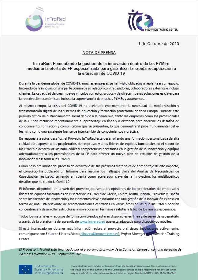 En respuesta a estos desafíos, el Proyecto InTraRed está desarrollando una formación personalizada de alta calidad para apoyar a los propietarios de empresas y a los líderes de equipos funcionales en el sector de las PYMEs a desarrollar las habilidades y competencias necesarias en la gestión de la innovación y equipar adecuadamente a los profesionales de la FP para ofrecer un nuevo plan de estudios de gestión de la innovación y asesorar a las PYMEs.