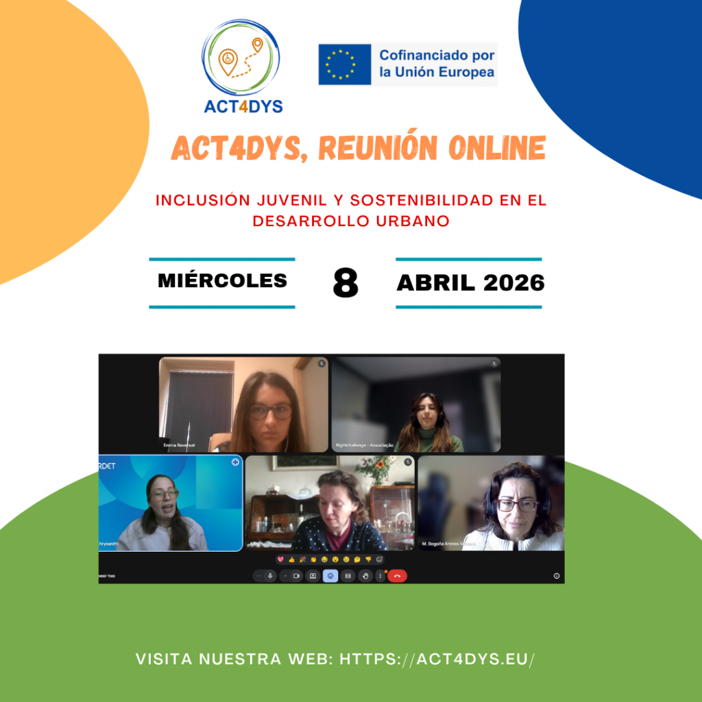 Como ya os hemos ido contando, el proyecto Erasmus+ Juventud destinado a mejorar la inclusión y sostenibilidad en el desarrollo urbano para jóvenes con discapacidades (ACT4DYS) tiene como objetivo transformar nuestras comunidades urbanas para que sean más accesibles, equitativas y pensadas para todas las personas. El proyecto comienza oficialmente su andadura en diciembre de 2024 y ya en 2026, hoy hemos celebrado una reunión online con los socios de Portugal, Chipre, Irlanda y Bruselas, en la que hemos empezado a alinear visión, objetivos y próximos hitos.