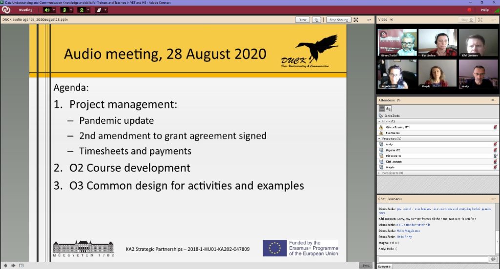 Hemos celebrado la tercera audioconferencia del año 2020 en el marco del Proyecto DUCK, Data Understanding and Communication Knowledge and Skills for Trainers and Teachers in VET and HE. hemos usado Adobe Connect, que está demostrando ser muy útil para estas reuniones online.