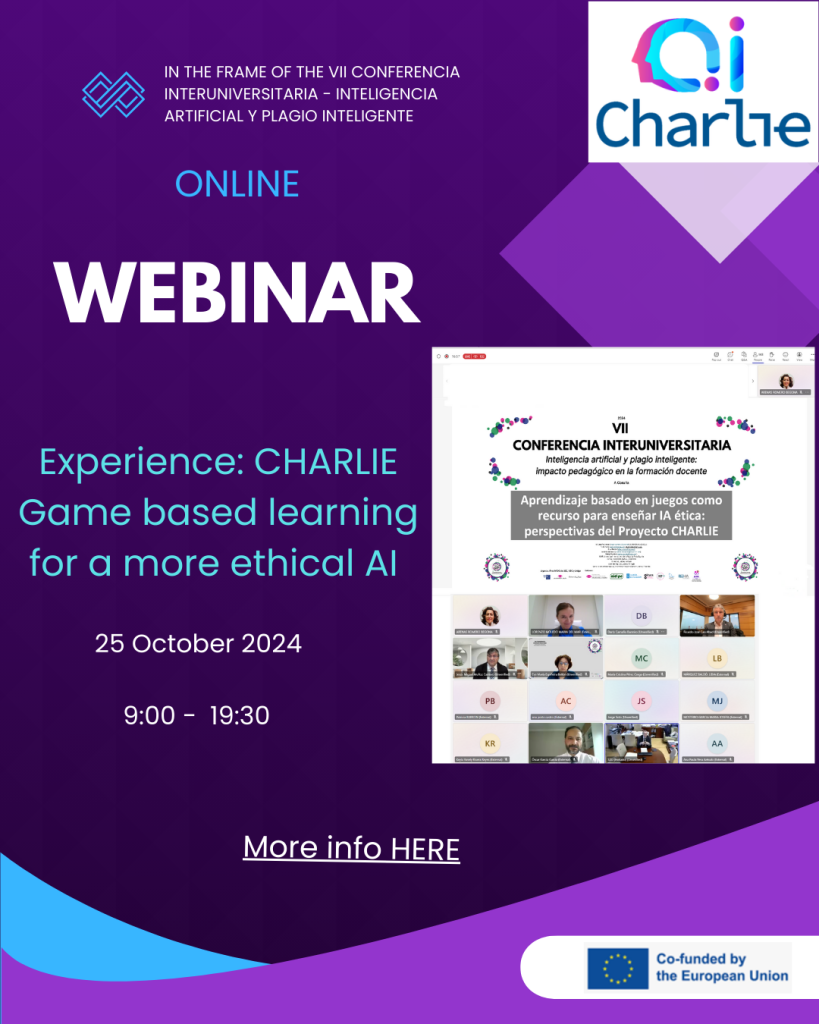 Webinar: presentamos CHARLIE hoy en la VII Conferencia Interuniversitaria: IA y plagio Inteligente – #IA, #etica, #educacionsuperior, #educacionadultos, #jóvenes